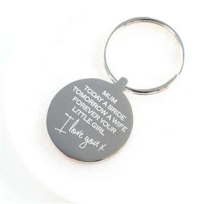 This polished silver keyring is engraved with 'Mum - Today a bride - Tomorrow a wife - Forever your little girl. I love you x'.