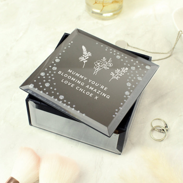 Personalised Floral Flower Diamante Mirrored Glass Trinket Box