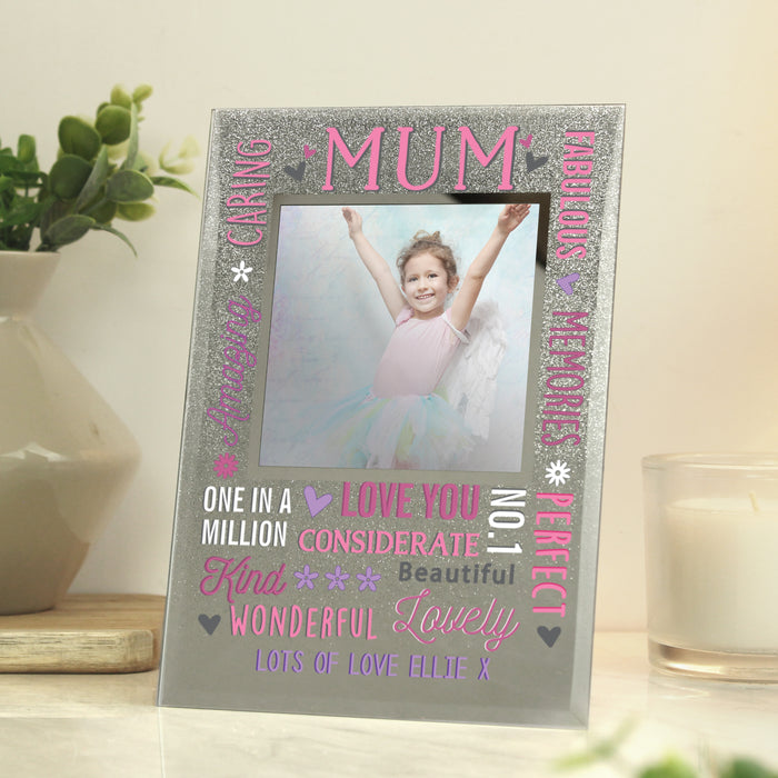 This personalised MUM 4x6 diamante glass photo frame features a gentle mirrored effect and results in a beautiful way to display a photograph.