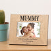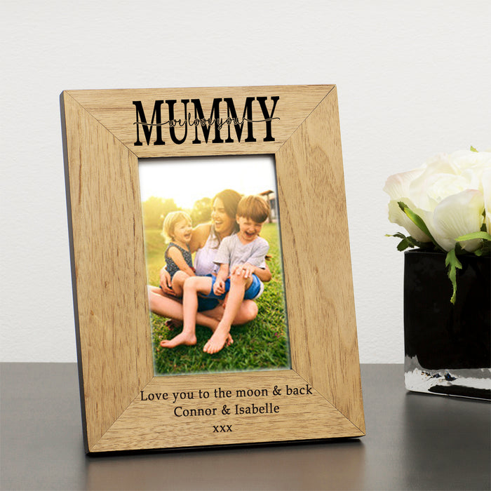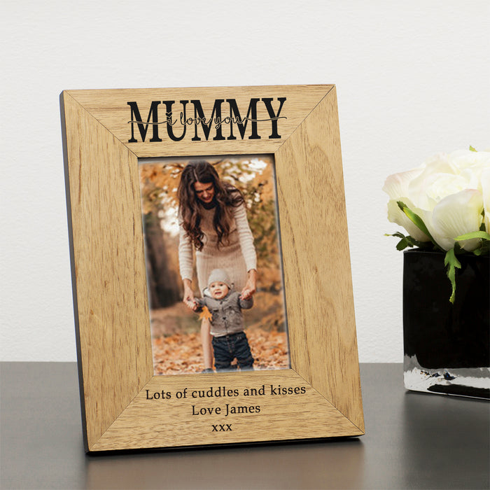 A high quality oak veneer wood photo frame. The top is engraved with a beautiful Mummy design, simply choose between I love you and we love you. The bottom of the frame is left free for your own personalised message.