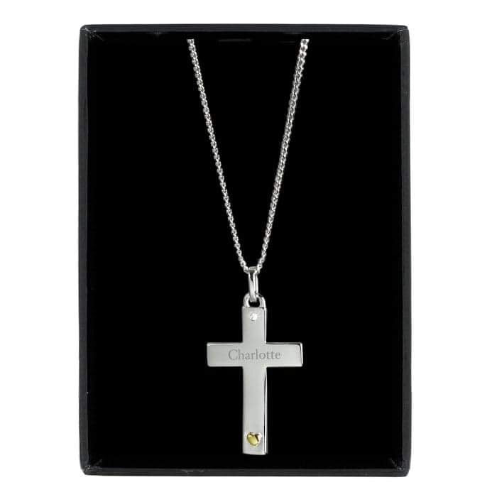 Personalised Sterling Silver Cross with 9ct Gold Heart & CZ Necklace