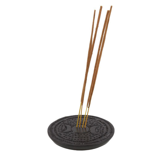 This soapstone incense plate features a carved triple moon design and holds up to four incense sticks.