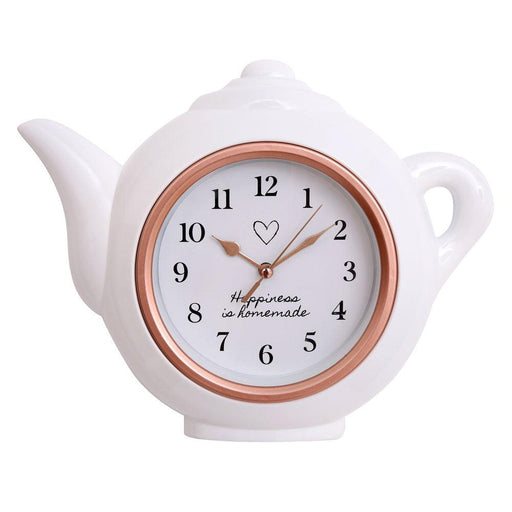 The perfect clock for checking if it's time for tea and cake! Ideal for decorating a cafe or tearoom this teapot shaped white clock has rose gold h...