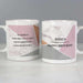 The mug can be personalised on the front with up to 2 lines, 15 characters per line. The back can be personalised with up to 4 lines of text, with a maximum of 20 characters per line.