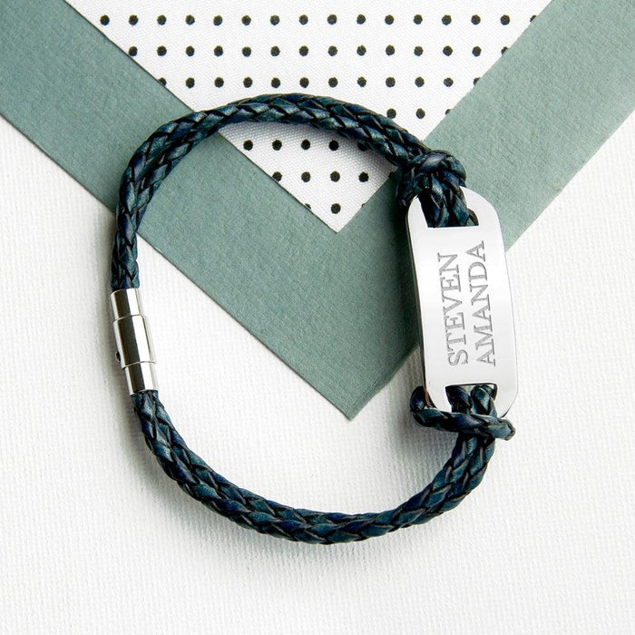 A statement men's leather bracelet, engraved with up to 30 characters. The bracelet is made from treated, hard-wearing woven leather and has a distinctive magnetic clasp for added security as well being easy to wear. With two knotted woven leather straps this bracelet stands out from the rest!