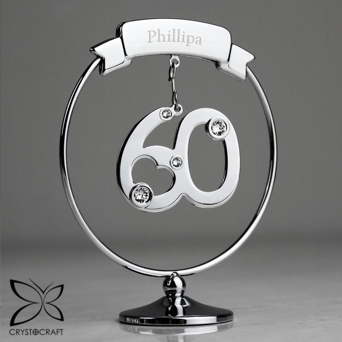 Mark their 60th Birthday with this elegant Crystocraft ornament. Dangling from a personalised round silver stand is a crystal clad 60. This will catch the light and bring a smile to the recipients face.