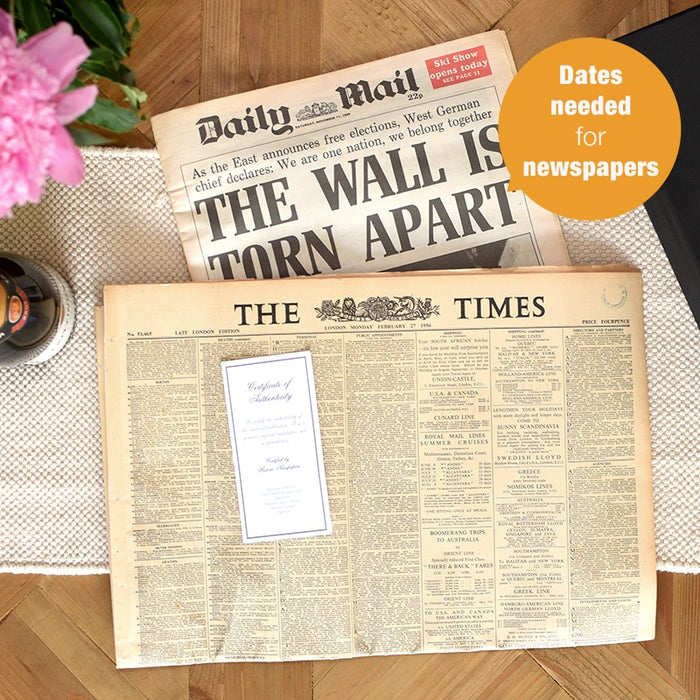 Inside a luxurious silk gift box lie two handpicked original newspapers - one for each of the married couple from any date you feel would be special.
