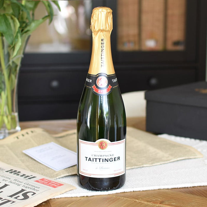 Between them sits a magnificent 70cl bottle of Taittinger branded champagne for the pair celebrating, perfect to toast their anniversary.