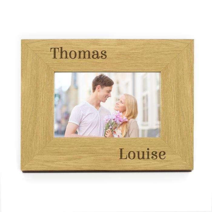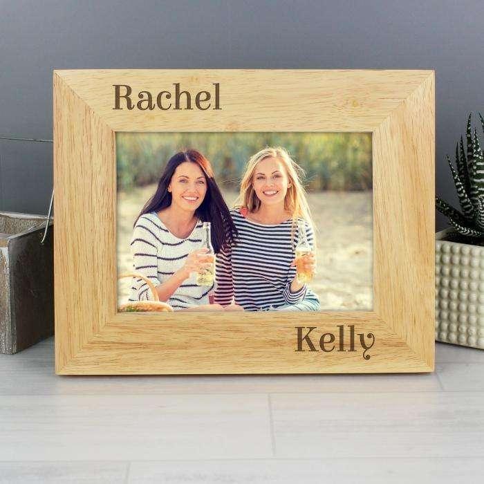 Personalise this 6x4 wooden frame with two names, 12 characters per name. One will sit above the photo and one below.
