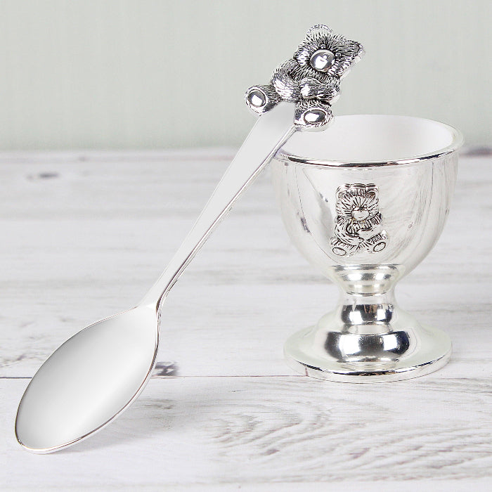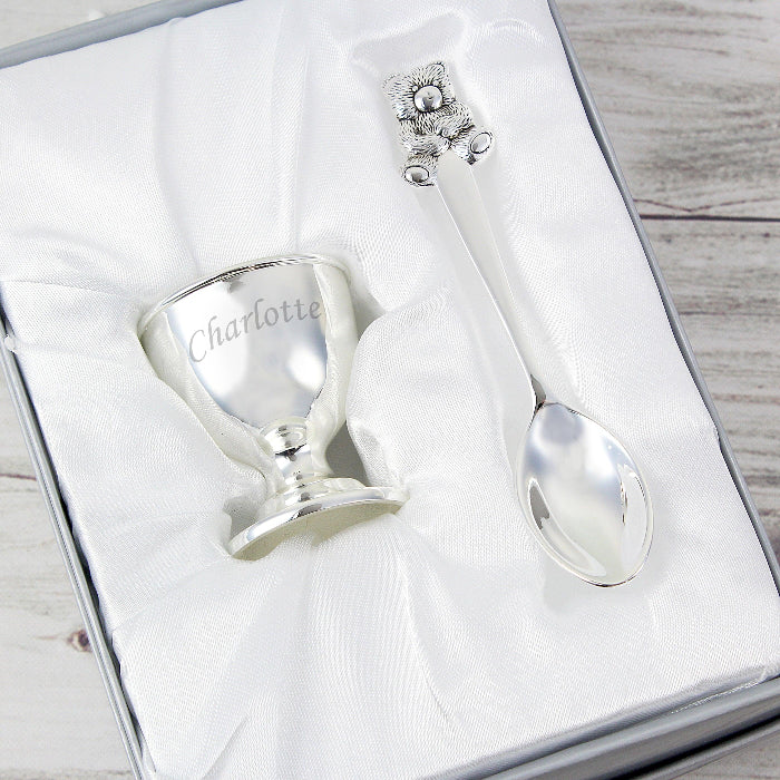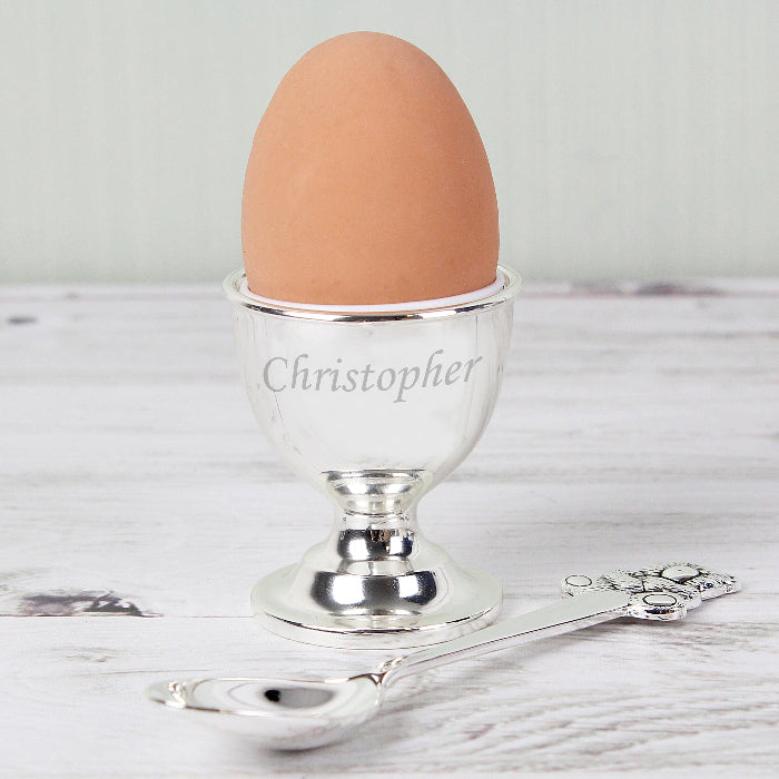 A beautiful personalised silver-plated baby gift set consisting of an engraved egg cup and spoon - a very popular present for a birth, Christening or Baptism.