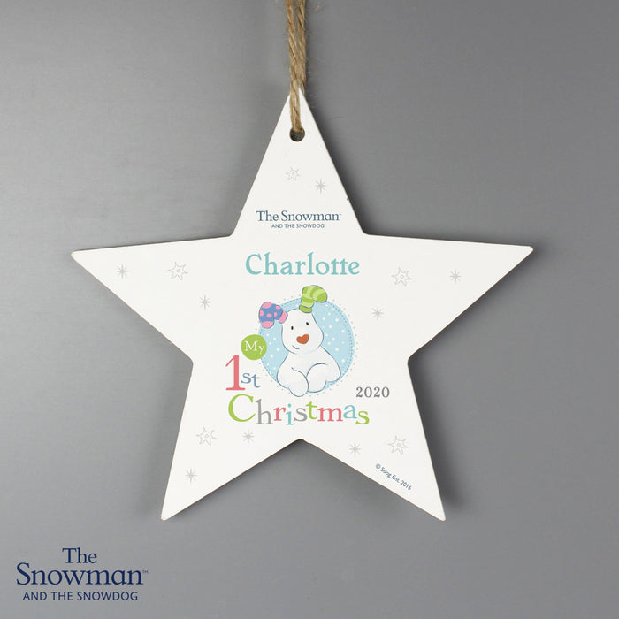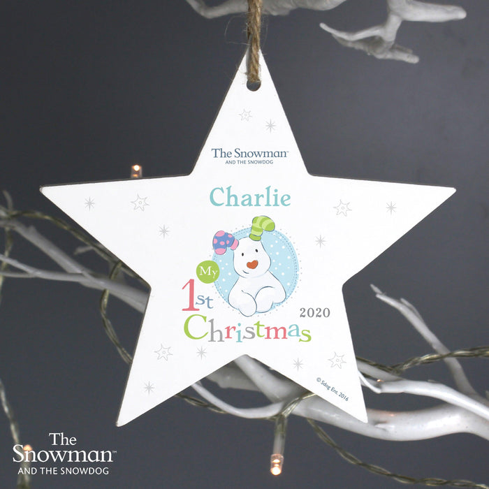 Personalised The Snowman and the Snowdog My 1st Christmas Blue Wooden Star Decoration