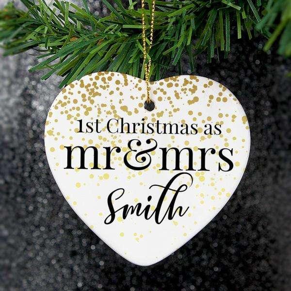 Celebrate a special first Christmas as a married couple with this Personalised Mr and Mrs 1st Christmas Ceramic Heart Decorations Decoration.