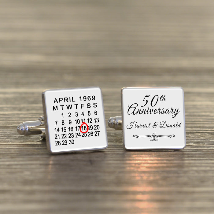High quality silver finish square cufflinks. One cufflink is personalised with a date, the other is personalised with the number of years and two names.