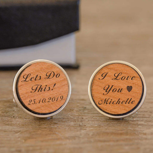 High quality silver finish round cufflinks with a cherry wood centre. Personalise with their initials and your wedding date. Supplied in a smart c...