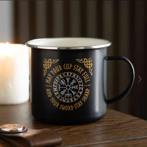 Kick off your day like a true Viking with this enamel-style mug that showcases the Vegvisir compass symbol. Its durable metal construction and stri...