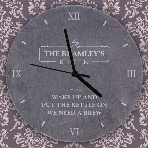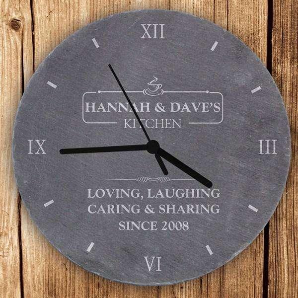 You can personalise this slate clock with a name/s up to 12 characters long (which will appear inside the banner). The word 'KITCHEN' is fixed. You can then personalise with a message over 3 lines up to 20 characters long. All personalisation is case sensitive and will appear as entered.