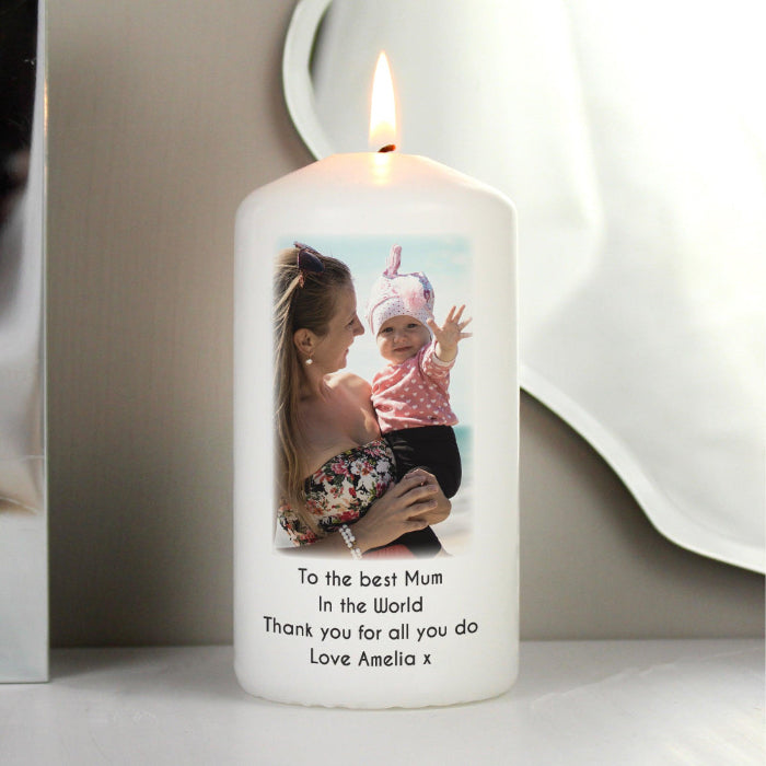 Personalised Photo Upload Pillar Candle - Keepsake Candle. Whether given as a gift for a Birthday, or a way to present to newlyweds with their first wedding photo to cherish.