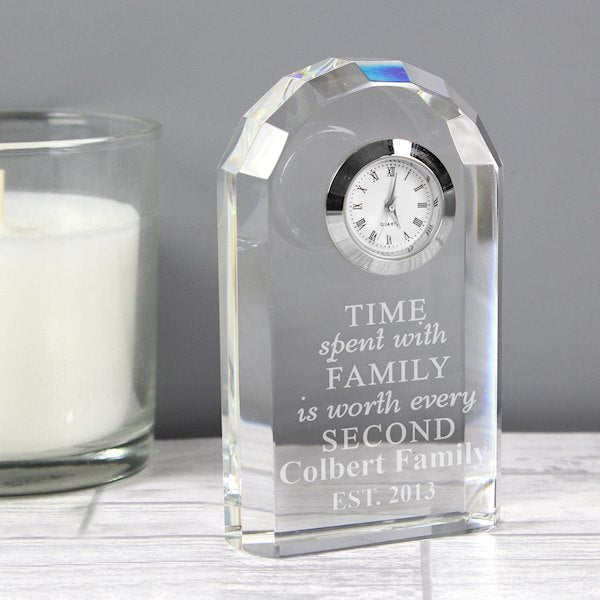 Personalise this Crystal Clock with a surname up to 15 characters and a line of text up to 15 characters long.