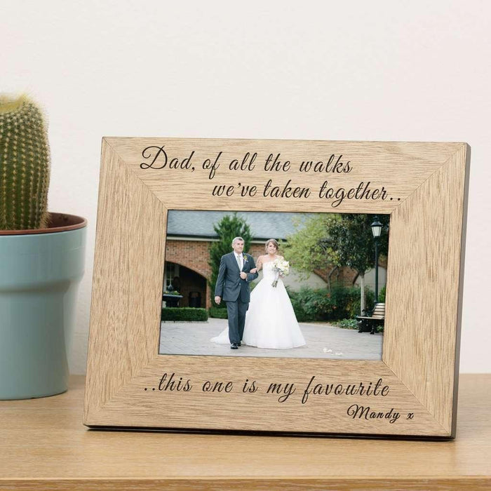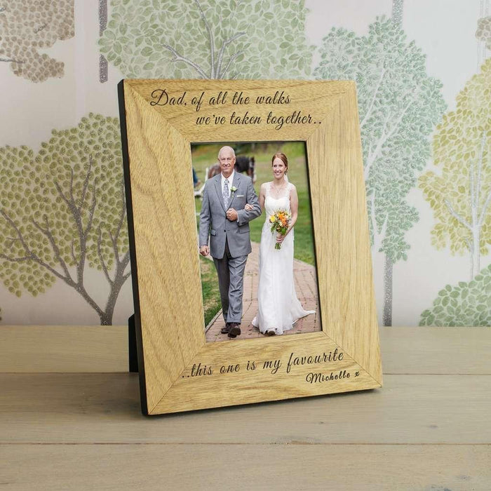 A high quality finish oak veneer wood frame. The top of the frame is engraved "Dad, of all the walks, we've taken together..". The bottom is engraved "..this one is my favourite", just add a name to complete the design.