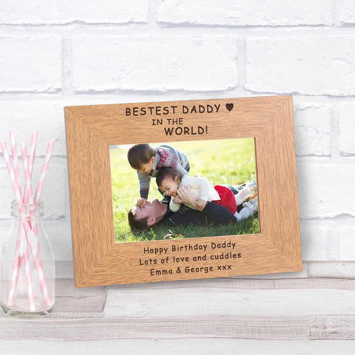 A stylish personalised oak finish photoframe. The top of the frame is engraved "Bestest Daddy in the World", the bottom of the frame is left free for your own personalised message up to 120 characters 3 lines 40 characters each line.