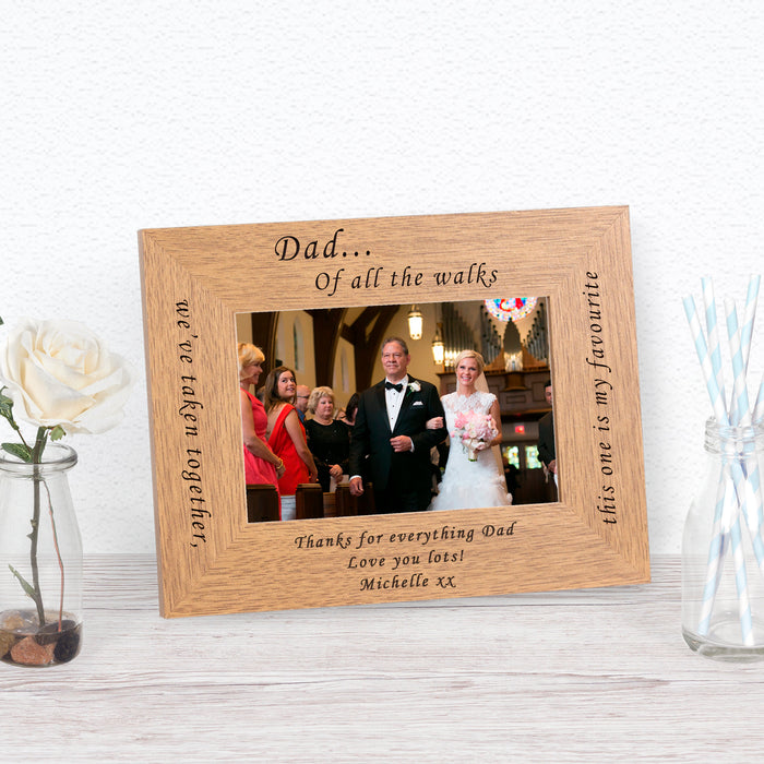 A stylish personalised oak finish photo frame. The frame is engraved Dad... Of all the walks we've taken together, this one is my favourite.