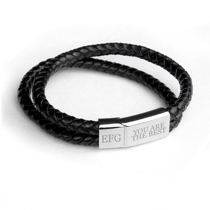 This dual leather woven bracelet in a stylish black can be personalised in two ways, initials and a short message. The bracelet is made from treated, hard-wearing woven leather and has a distinctive clasp for added security as well being easy to wear.
