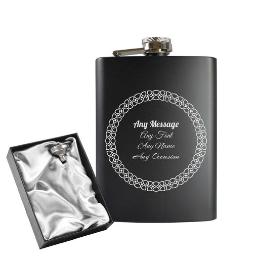 Have a warming drink on the go with this personalised Engraved 8oz matt black hip flask. Customise this heart border design with any message . T...
