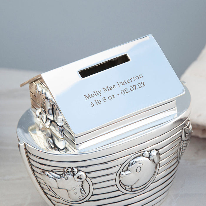 Our super cute Personalised Silver Plated Noah’s Ark Money Box will make the perfect gift for any kid who’s looking for somewhere special to store their pocket money. It’d also make a great Baby Shower, First Birthday or special Christmas present from Santa himself. Perfect for encouraging your little one to start saving at an early age, designed to look like the classic representation of Noah’s Ark and has been especially hand finished with love and care just to bring joy and laughter into your little one’s life, as they learn about money.