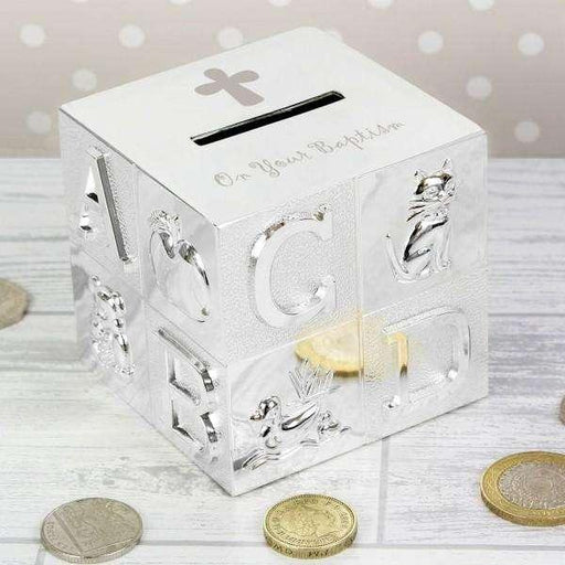 This silver plated ABC Cube Money Box features a cross motif and the wording "On Your Baptism" as standard text.Money Box is nickel plated. Ideal f...
