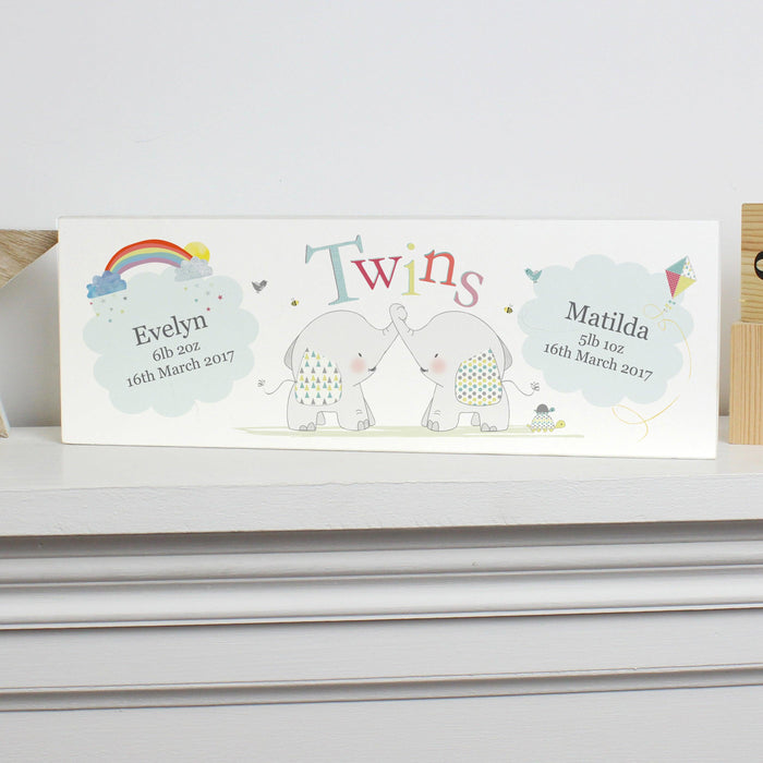 Personalised Hessian Elephant Twins Wooden Block Sign