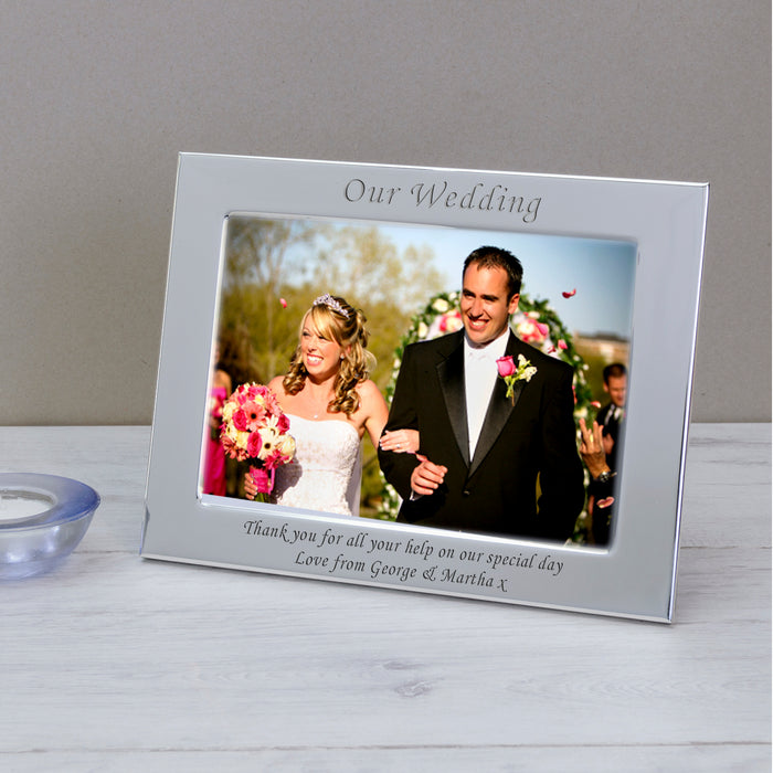 High quality silver plated frame.The top reads "Our Wedding". The bottom is left free for your own personalised message.