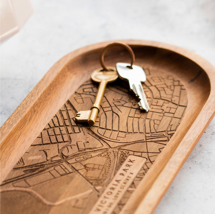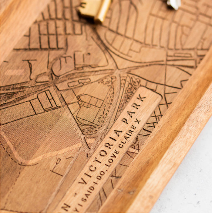 The wooden tray will be engraved expertly with a stylised, gorgeous map design of the location of your choice. A beautiful gift celebrating a special place. Simply enter a post code of your choice and we'll do the rest, creating a stunning illustrated map that makes for a truly special gift. A location and a short message will be engraved to the box beneath your map design.