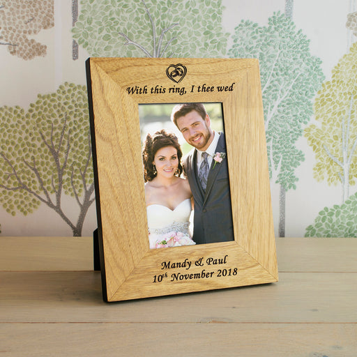 A high quality finish oak veneer wood frame. The top is engraved with "With this ring, I thee wed" and the bottom of the frame is left free for you...