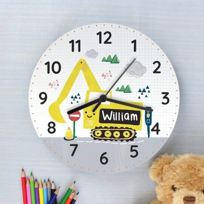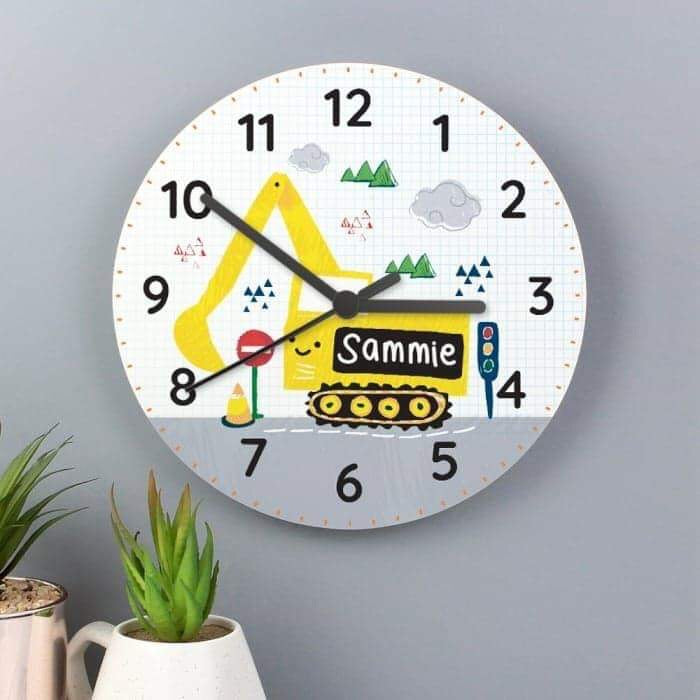 Our Personalised Digger Wooden Clock will look fantastic hung in a bedroom or nursery!
