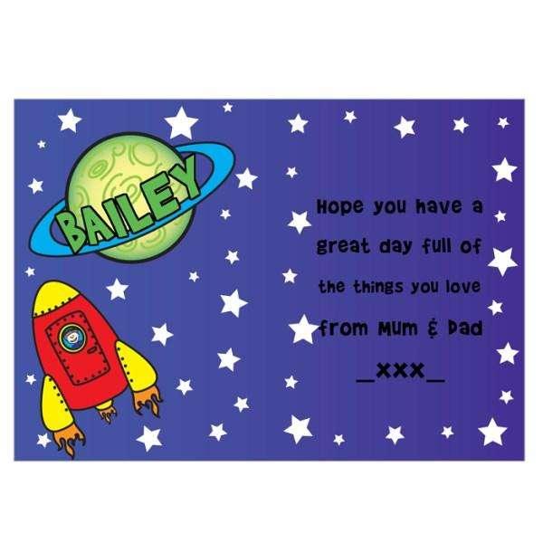 Personalise this Space Card with a message up to 20 characters and first name up to 12 characters on the front.
