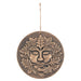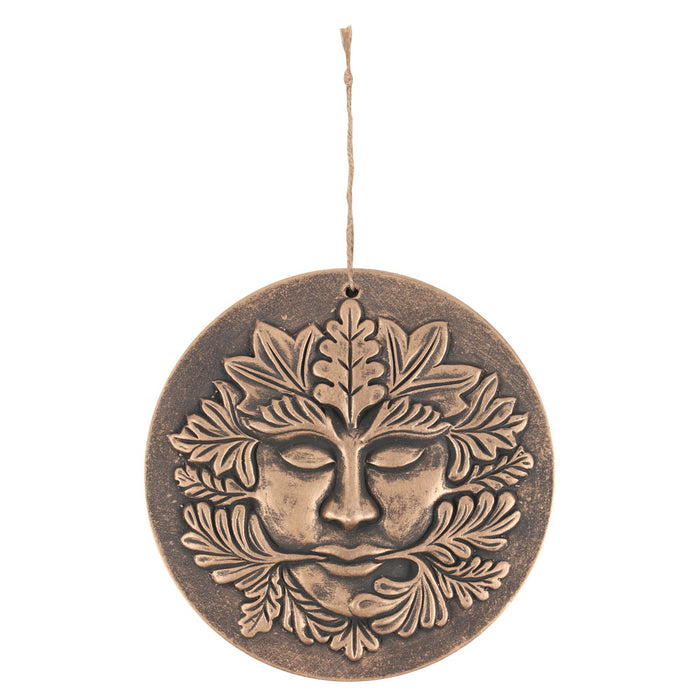 This terracotta plaque features the face of a leafy green goddess in a bronze-like finish.