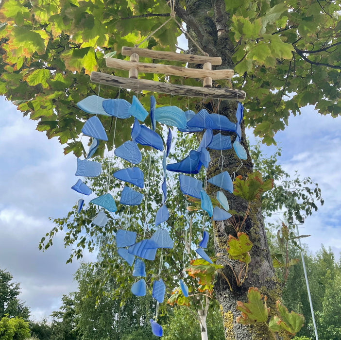 Three Stick Recycled Glass Driftwood Wind Chime - All Blues