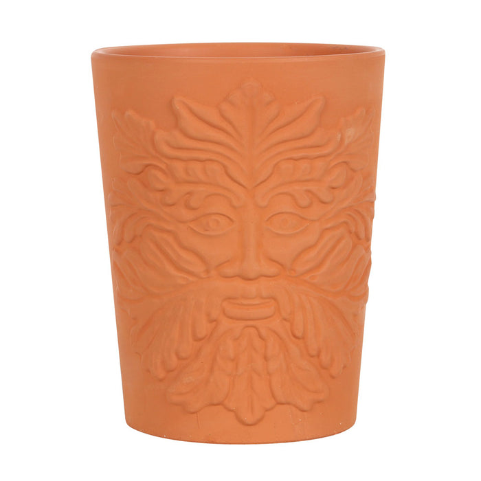 This terracotta plant pot features the face of a leafy Green Man, also called the Man of the Wood or the Tree Man, a pagan symbol of growth, fertility and rebirth.