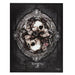 This small canvas plaque features the detailed 'Dioscuri' artwork by the popular Alchemy Gothic of London. A pair of fanged skulls are wrapped in roses and thorns in this greyscale piece. 19x25cm. The digital watermark will not appear in the print design.
