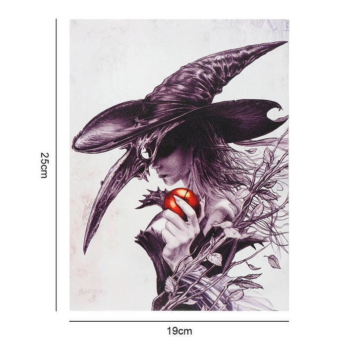 This small canvas plaque features a high resolution print of the art design 'So Mote It Be' by Alchemy. The design is a visually striking and unique piece, printed in black and white with just the apple showing in a burst of red colour.