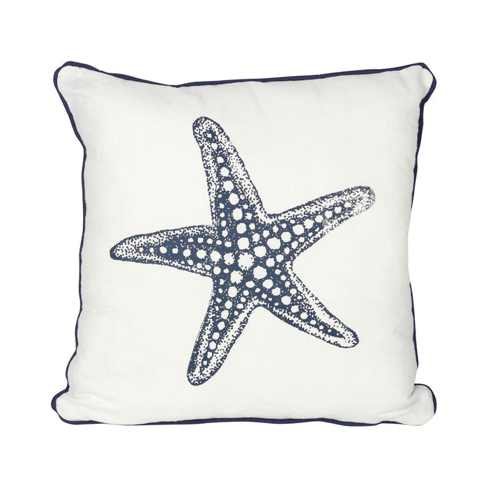 Freshen up your home décor with this gorgeous white cushion featuring a dark blue starfish illustration. A great nautical accent piece for a bedroom or living room.Packaged Dimensions: H33.5cm x W33.5cm x D4cm