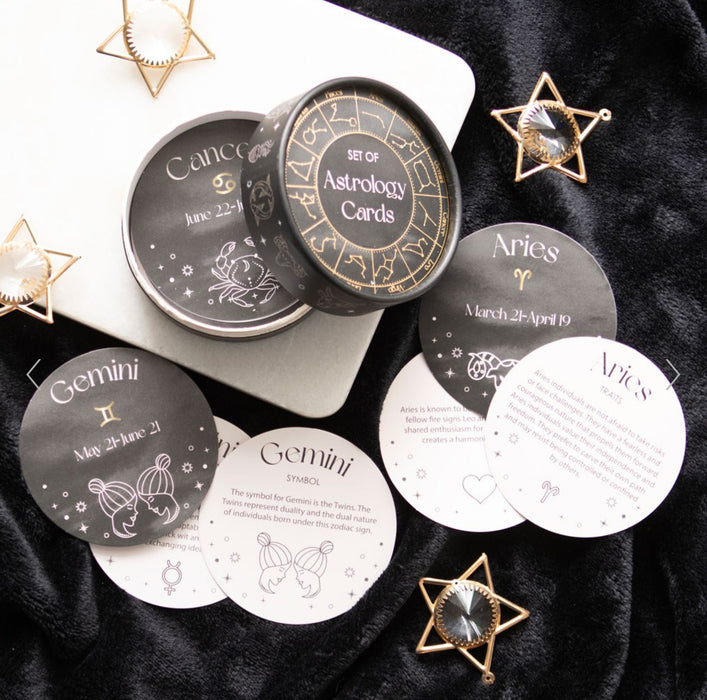 Each circular card includes detailed information about each zodiac sign including its ruling planet, personality traits, compatibility and elemental symbol. Whether given as a gift or used for personal self-discovery.