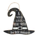 A great decoration for Halloween, this hanging witches hat sign features the words 'A Witch Lives Here With Her Little Monsters'.