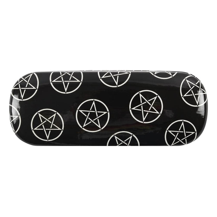 A black glasses case with an all-over pentagram pattern. The case also comes with a handy cloth for cleaning glasses.