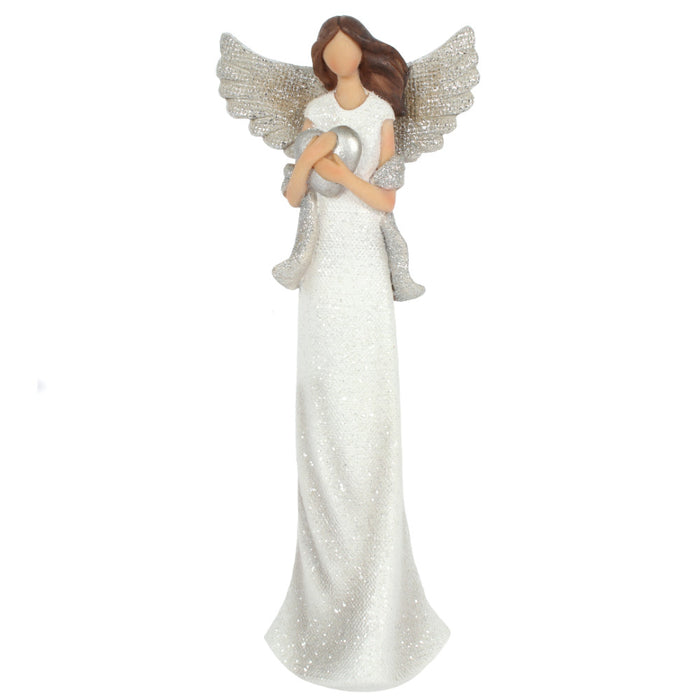 Amara is a medium sized angel with a subtle glittering finish and understated metallic silver detailing to her wings. A beautiful ornament for the home.