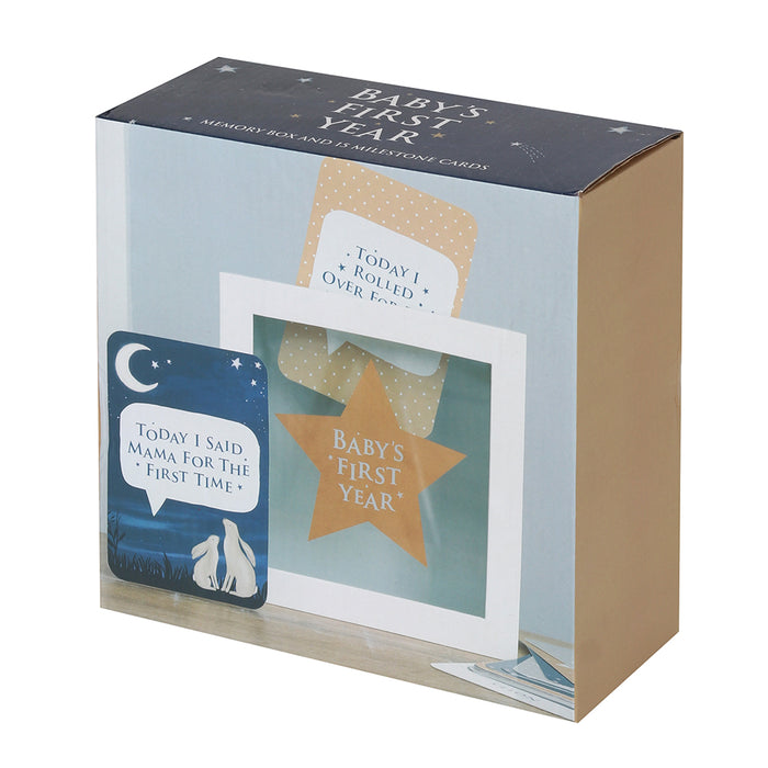 This wood and glass keepsake box with milestone cards is the perfect piece to track and celebrate Baby's first year. Makes a sweet and sentimental baby shower gift for new mums and dads. Includes 15 milestone cards that include events such as first steps, first bath, and first time sleeping through the night. Product Dimensions: H18cm x W18cm x D7.5cm Packaged Dimensions: H19cm x W19cm x D8.5cm