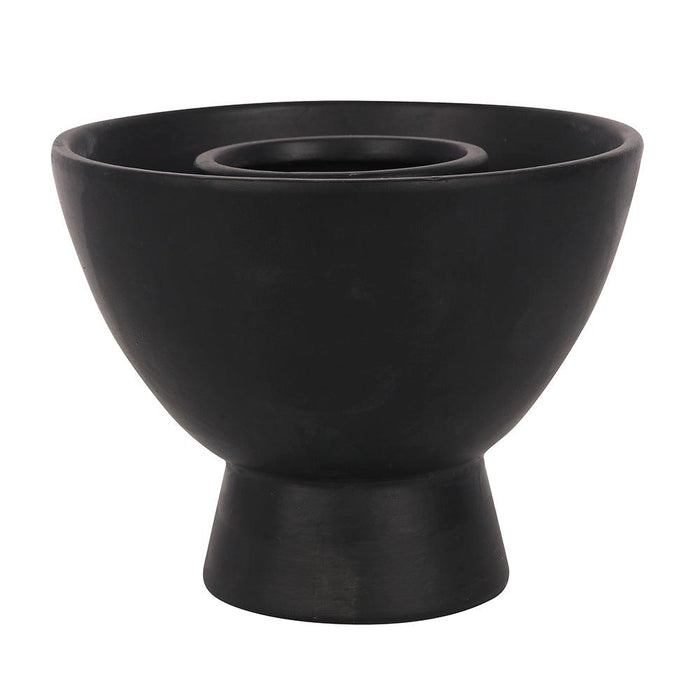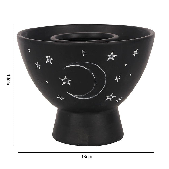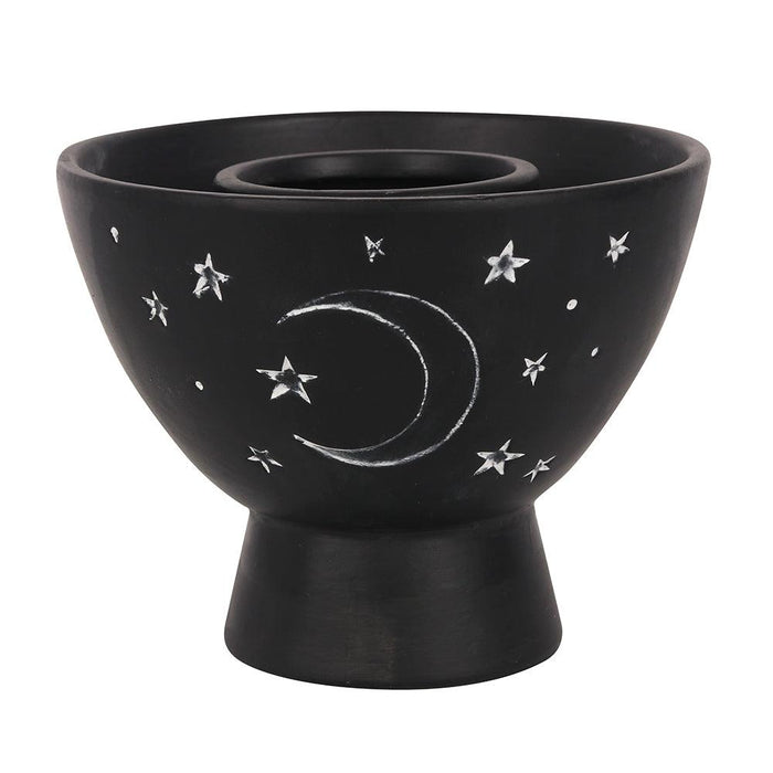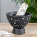 This black terracotta smudge bowl is detailed with a stunning crescent moon and stars design.