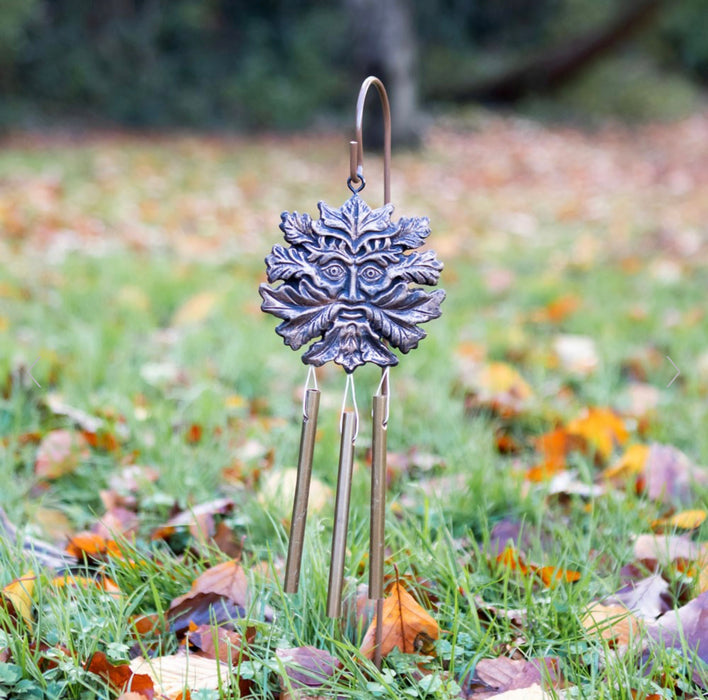 Three chimes hang from a resin Green Man face in a bronze-like finish.