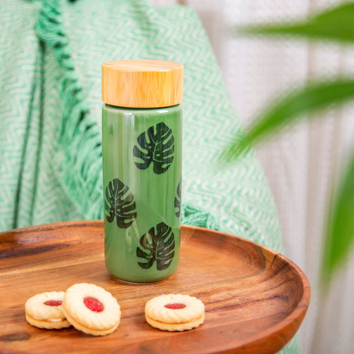 This ceramic drinks bottle is complete with a botanical green colourway and cheese plant repeat pattern. The handy double-wall keeps drinks hot or cold for an extended time. Each one beautifully unique with a bamboo lid and hand-finished glaze.