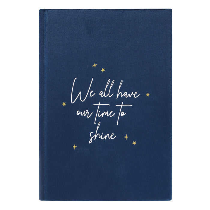 Stunning blue velvet A5 notebook with the words 'We all have our time to shine' printed onto the front cover. Inside you'll find white lined papers, perfect for jotting down thoughts and ideas to keep you motivated. The reverse of the notebook features a beautiful celestial design in white with metallic gold stars.Packaged Dimensions: H21.3cm x W14.7cm x D1.7cm